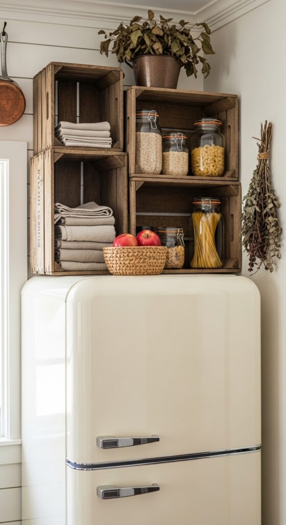 Let’s flip the vibe completely. Think reclaimed wood, slightly rough edges, and that imperfect, handmade charm. Above the fridge, a crate-style cabinet setup brings a natural soul to a modern kitchen. Each box could hold something different cookbooks in one, wine bottles in another, or even just baskets filled with things you don’t wanna see lying around.