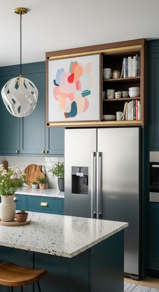 Why not turn that above-fridge space into a mini gallery moment? Instead of traditional doors, think sliding art panels. Yep actual artwork, framed and mounted on sliding tracks that move aside to reveal hidden storage behind.