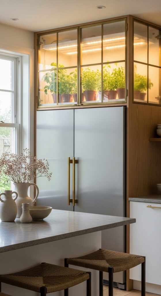 Now, this one’s pure joy. Turn the space above your fridge into a tiny indoor greenhouse. Yep, real plants, glass-front doors, and maybe a built-in grow light that keeps your herbs thriving all year long.