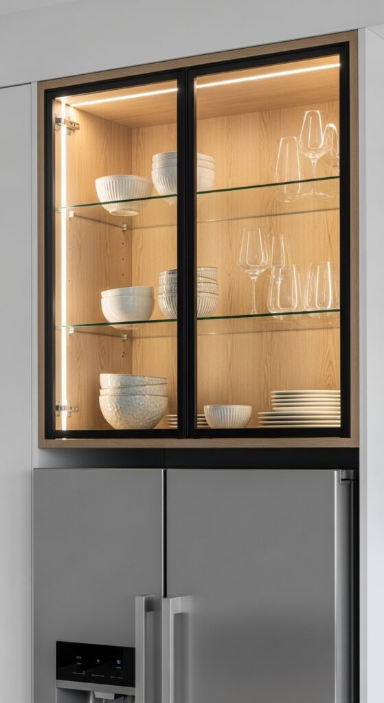 Picture this: instead of a bulky wooden block above your fridge, you’ve got a sleek, floating glass cabinet that practically levitates off the wall. The glass doors are tinted just enough to tease what’s inside maybe a collection of vintage mugs or your secret stash of fancy teas. It adds this quiet shimmer that makes the whole kitchen feel lighter, kinda airy, almost hotel-like.