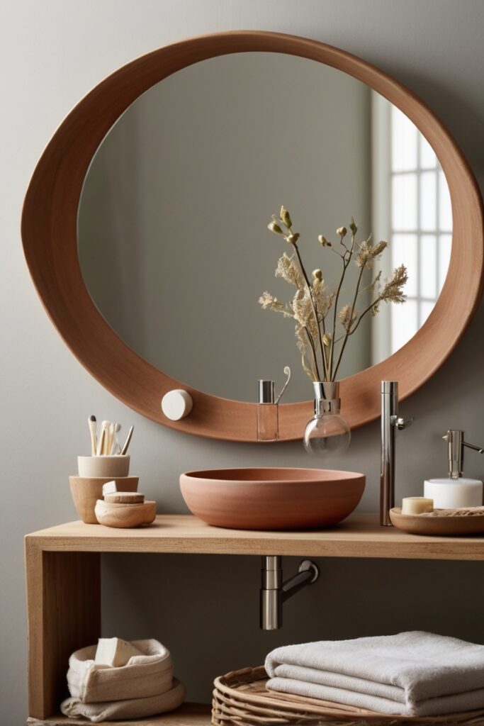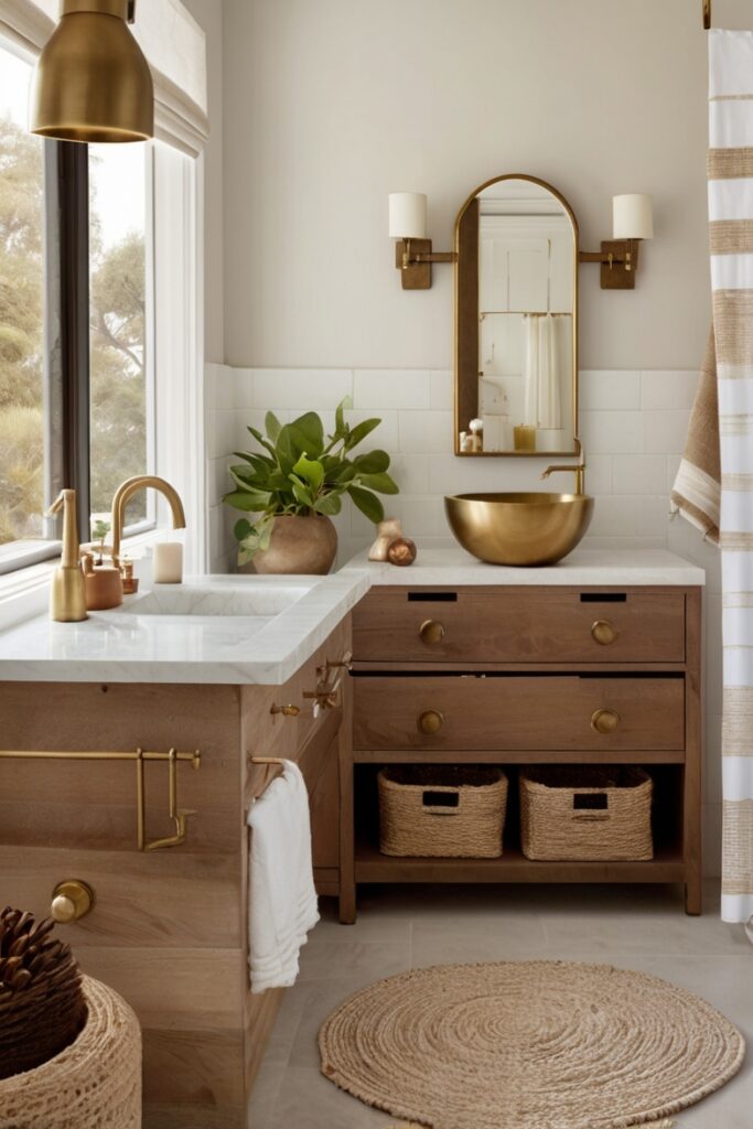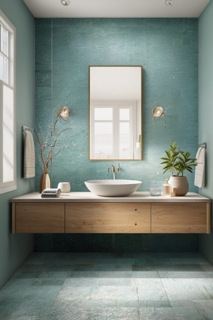 Install them imperfectly. Seriously. Slight spacing variations, a few tiles turned vertical instead of horizontal. Grout in warm gray, not white, because white kills the mood fast. This wall doesn’t want attention, it wants curiosity. You catch yourself staring while brushing your teeth, drifting a bit. That’s coastal bliss sneaking in, uninvited.