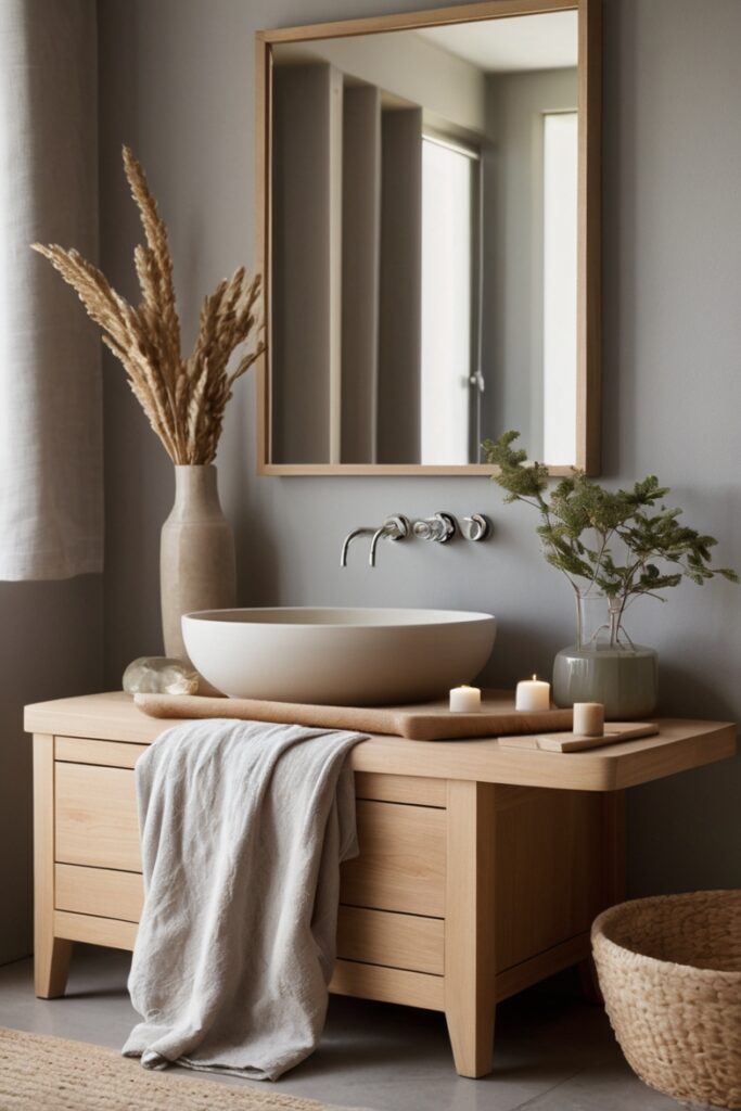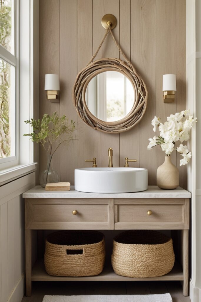 What makes this idea current is restraint. No seashell knobs, no rope handles screaming theme. Just pale wood, soft grain, and maybe one knot left visible on purpose. Lighting matters here, too. Use low, warm LEDs under the vanity so the wood glows at night, almost like it remembers fire. It’s imperfect, slightly crooked sometimes, and that’s the point.