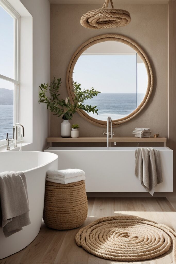 Rope isn’t banned, it’s just grown up. Designers are using it as a subtle accent: a wrapped handrail, a single towel hook, a mirror suspension cord. Natural fibers only, slightly rough, never glossy.
