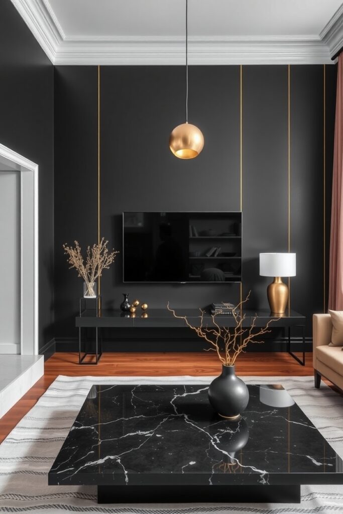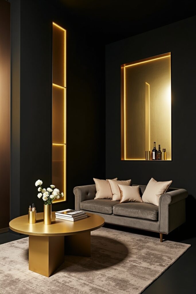 2025 has made minimalism grow up a bit. It’s no longer sterile white boxes—it’s black and gold with restraint. Imagine walls painted in charcoal with sleek gold lines running across like delicate veins.