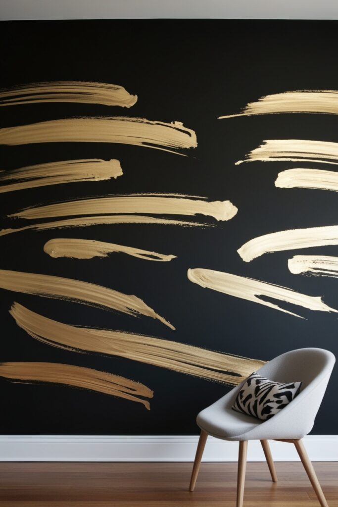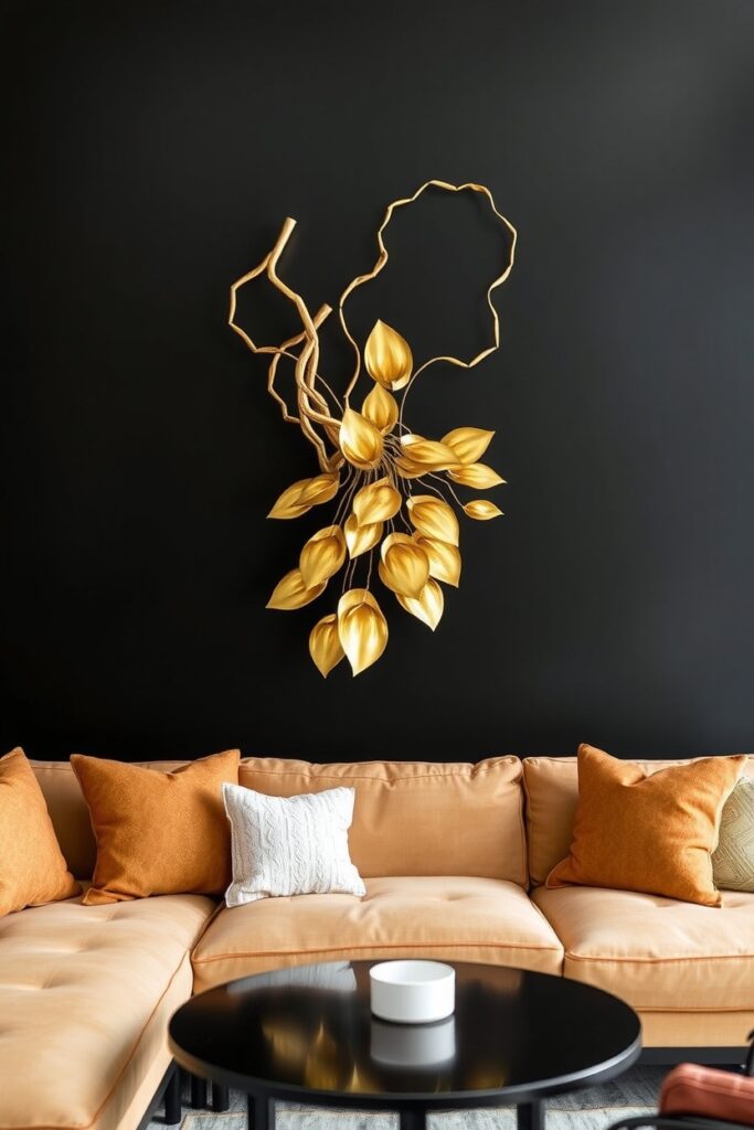 A matte black wall can hold sculptural gold art twisted metal, flowing forms, or a cluster of gold leaf pieces shaped like falling petals.