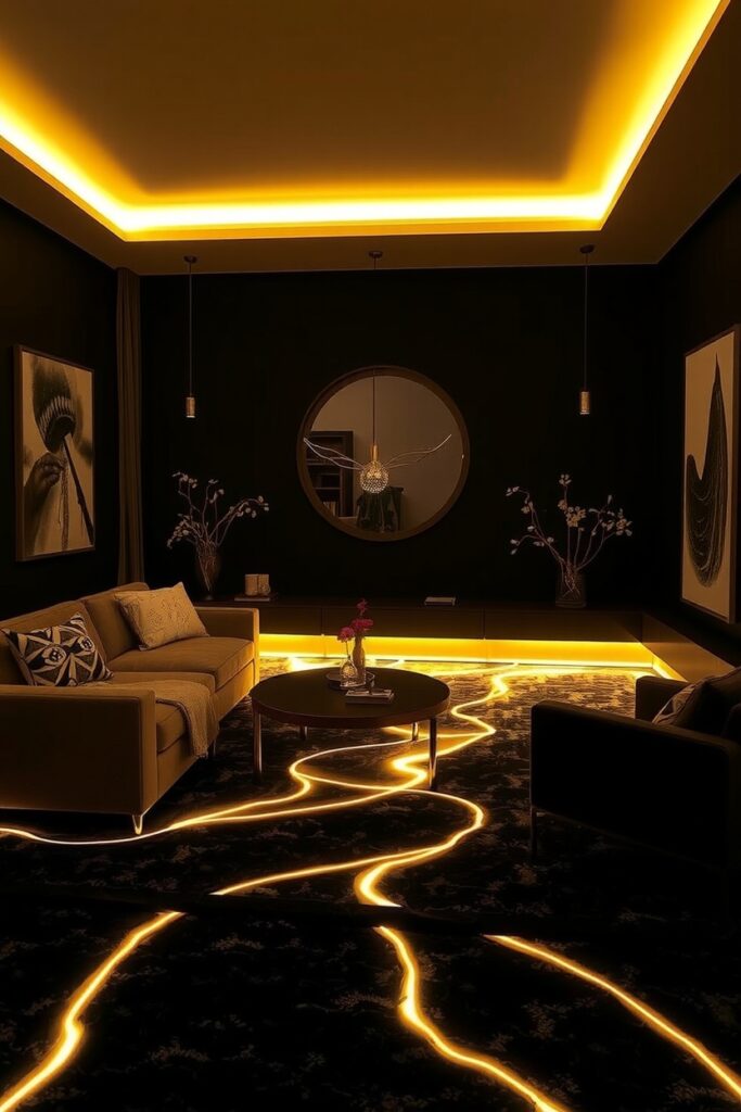 Install gold LED strips under furniture edges or along ceiling coves so it looks like molten light sliding through the space.