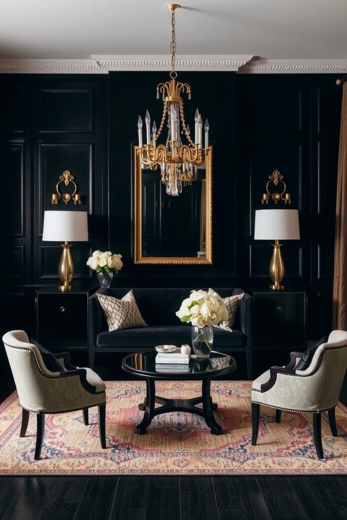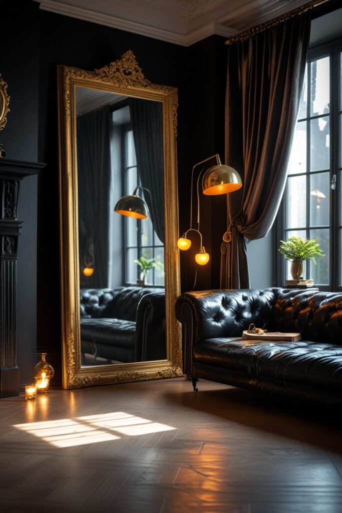 Picture this: matte black walls, heavy golden drapes, and a giant floor mirror with an antique gold frame that looks like it’s seen centuries. The vibe? A little dramatic. A little theatrical.
