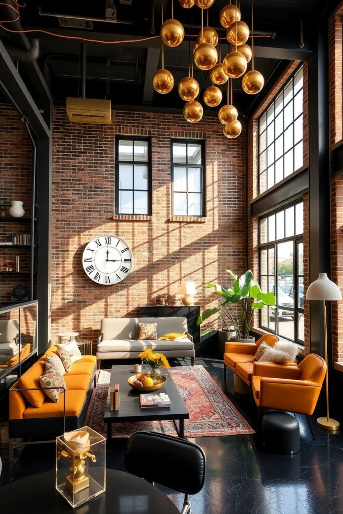 Think industrial lighting dipped in soft brass. Maybe a giant gold clock hanging like an art piece. Or a cluster of golden orbs floating above your coffee table, throwing warm shadows on the black floor.