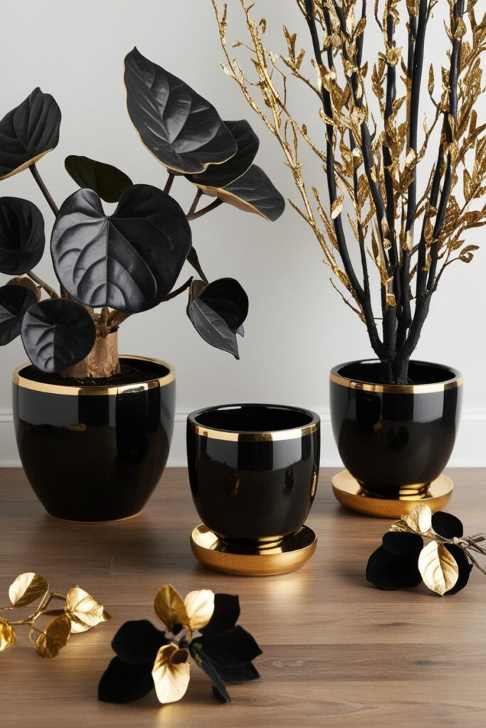 Add black ceramic planters with golden rims, filled with dark-leafed plants like rubber figs or black begonias.