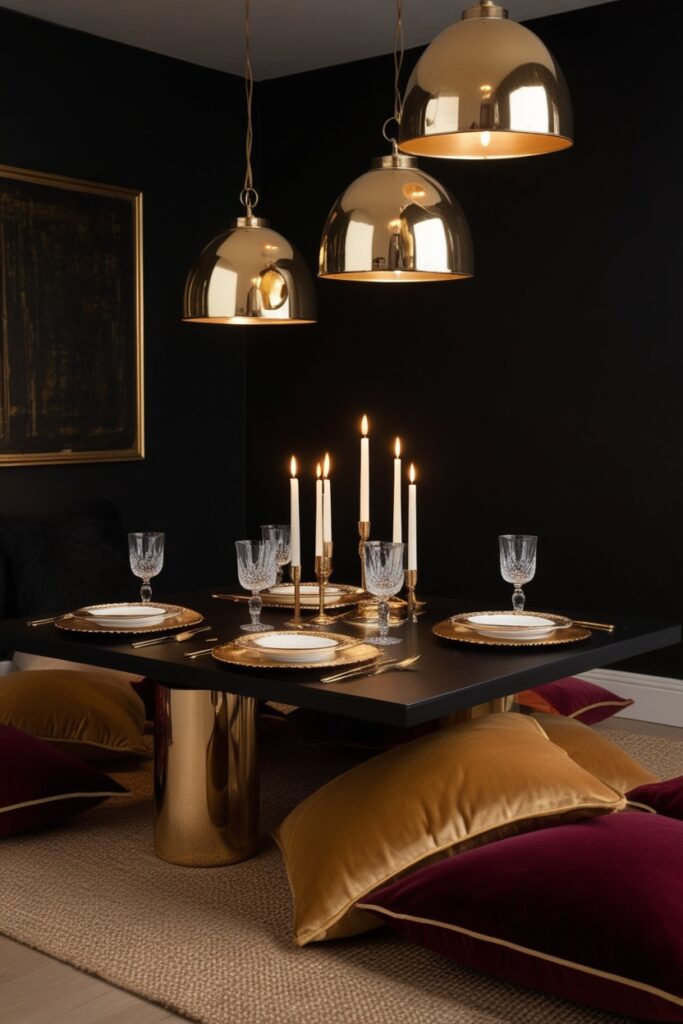 Think a black room lit only by golden lamps and candlelight. Maybe a low table with crystal glasses, gold-edged plates, deep velvet cushions on the floor.