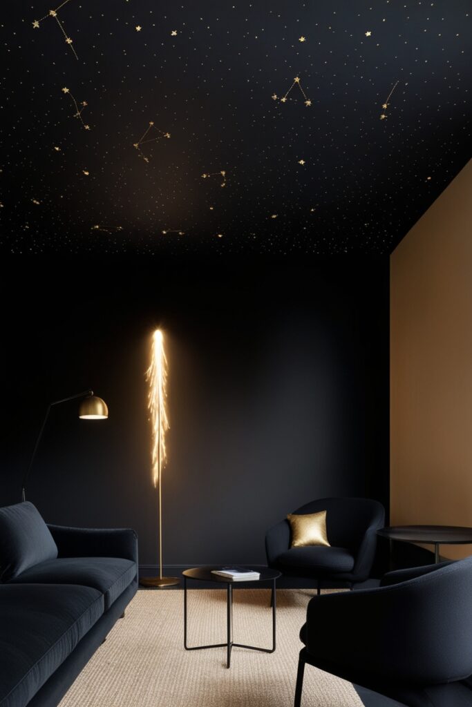 A long golden floor lamp mimics a comet streaking softly through the night. You could even use subtle LED lighting that glows like starlight. The furniture remains grounded matte black surfaces, soft edges, nothing too bright.
