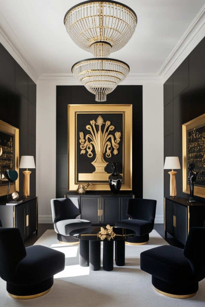 Modern royalty doesn’t need chandeliers that blind. It’s all about controlled glamour now. Sleek black panels, large golden art pieces, and bold sculptural furniture.