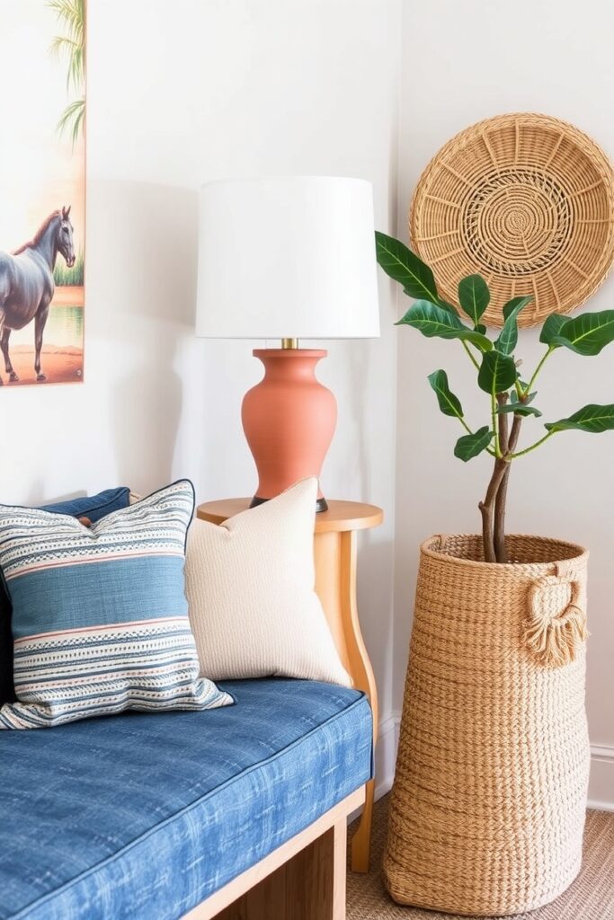 A denim-upholstered bench. A coral clay lamp base. Woven baskets the color of faded sand. It’s tactile, rough, beautiful.
