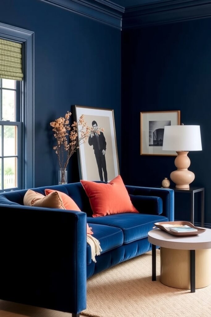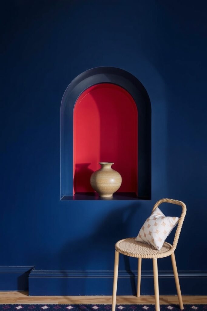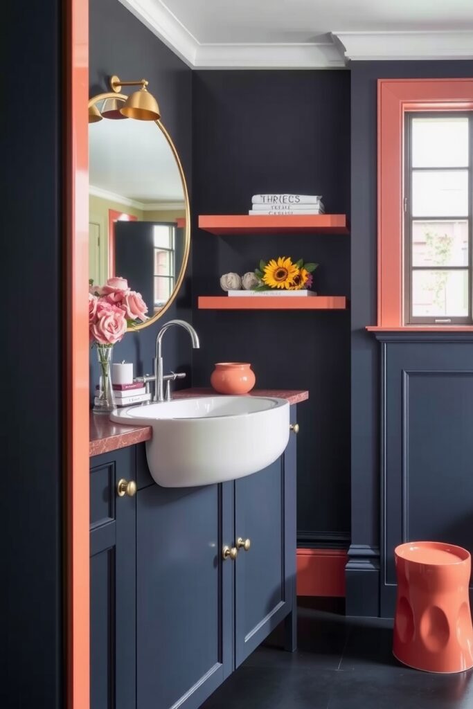 Use matte navy walls, then add glossy coral ceramics or lacquered coral trim. The light bounces softly, changing through the day.