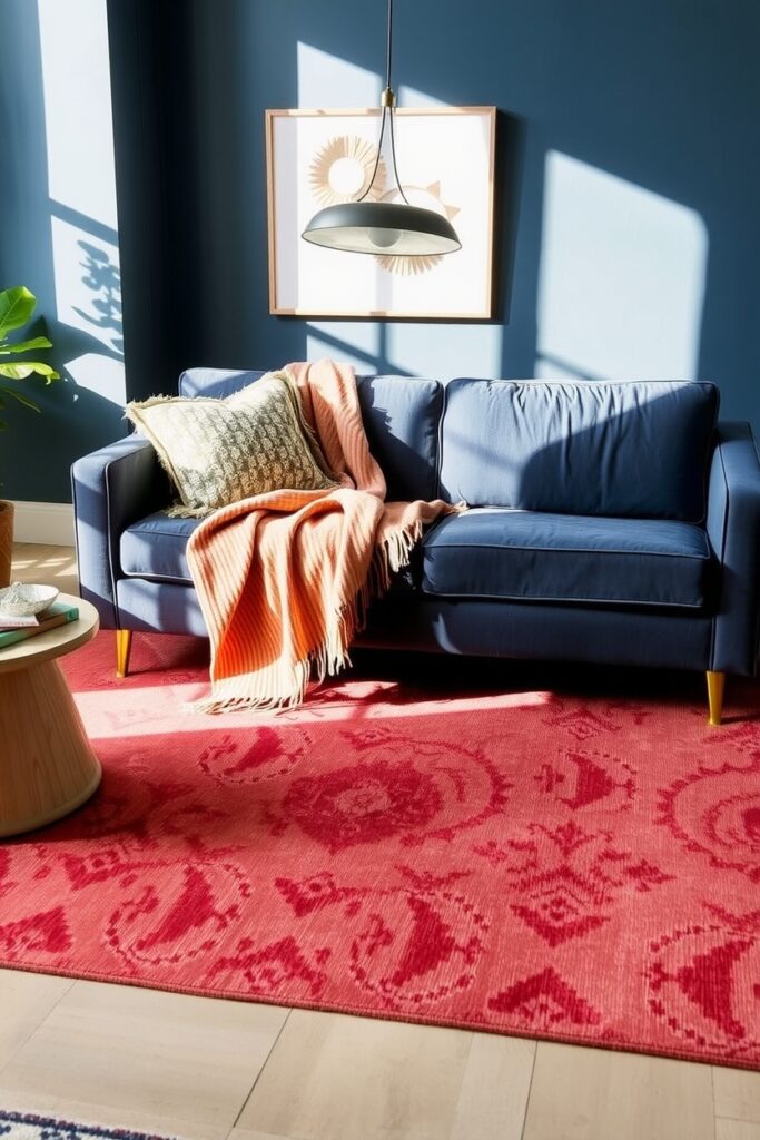 A coral rug under a blue sofa sounds simple but it’s pure alchemy when the tones are right.