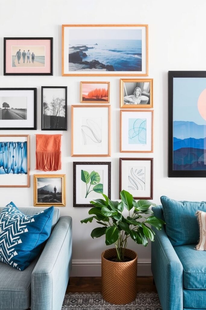 Instead of one big artwork, create a curated wall that tells a story from blue tones to coral hues, left to right. Like a gradient of emotion.