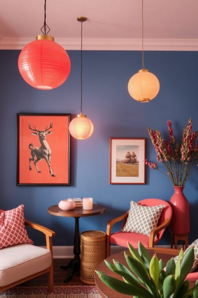 A coral-tinted glass globe or paper lantern gives a soft peach light that flatters every surface (and person). Against blue walls, it feels like sunset trapped indoors.