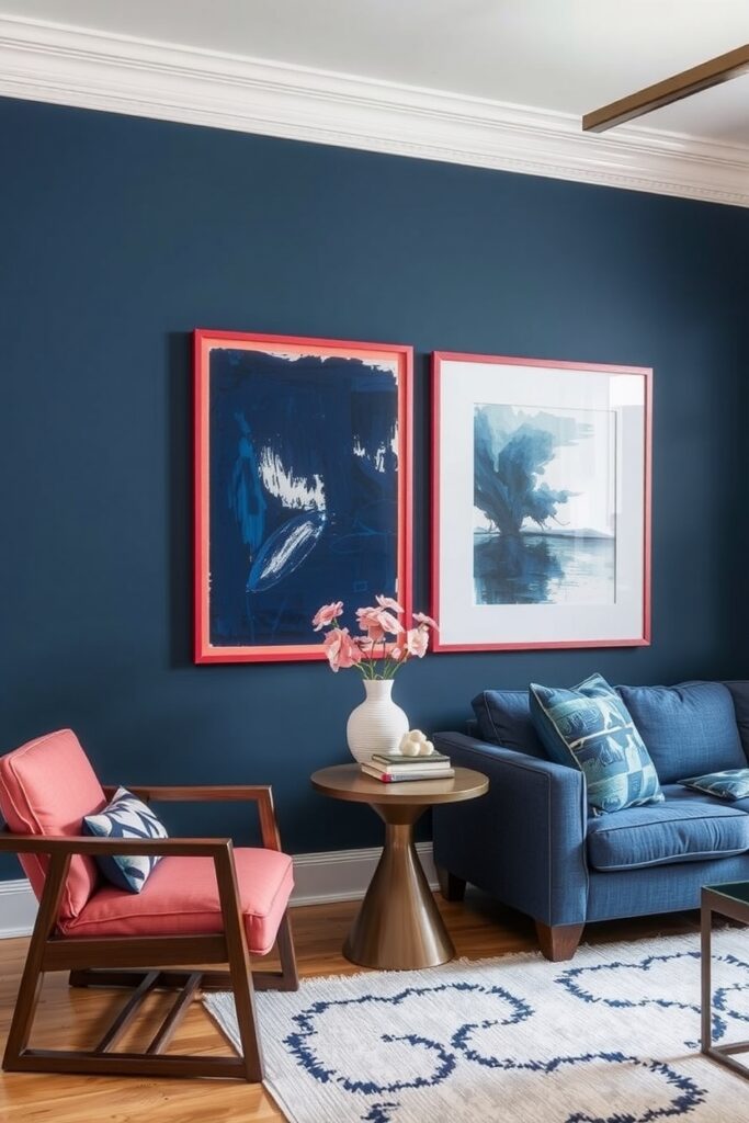 Forget matching decor. Let your art pull double duty deep blue abstract pieces inside matte coral frames. Or coral sketches outlined in midnight blue wood.