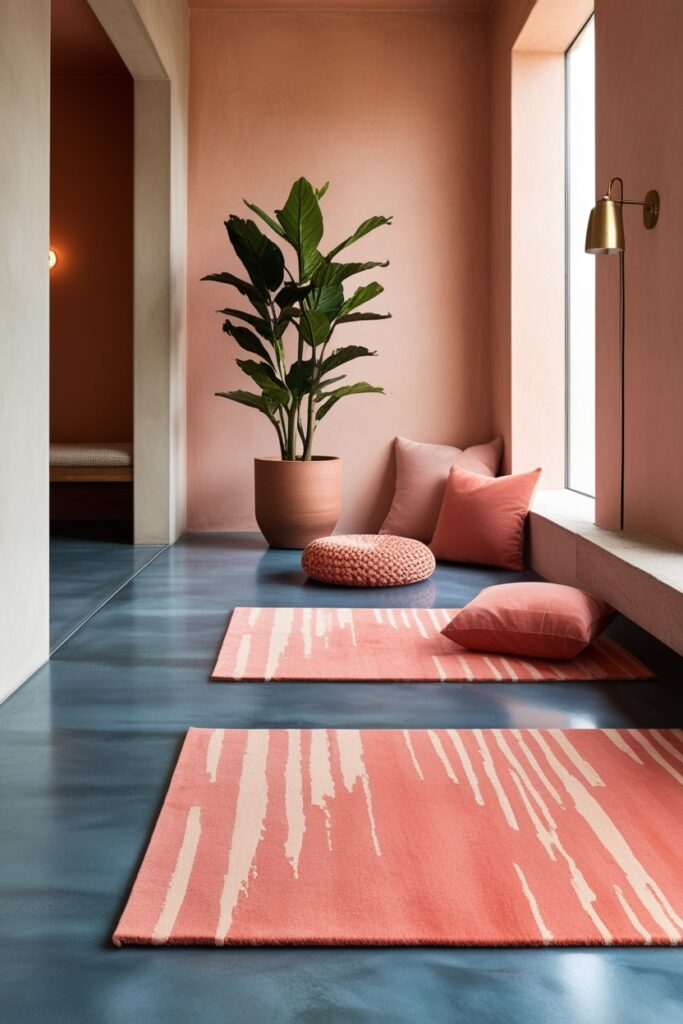 Imagine a floor in muted steel-blue, with coral rugs that look like abstract brushstrokes on top. Add warm brass lighting, a creamy plaster wall, and a big plant in a terracotta pot. Suddenly, industrial feels soulful.