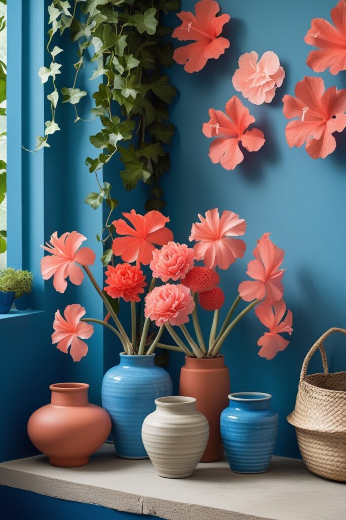 Try anthuriums, begonias, or dried coral peonies in ceramic vases. They bridge the color story softly, like nature understood the palette before you did.