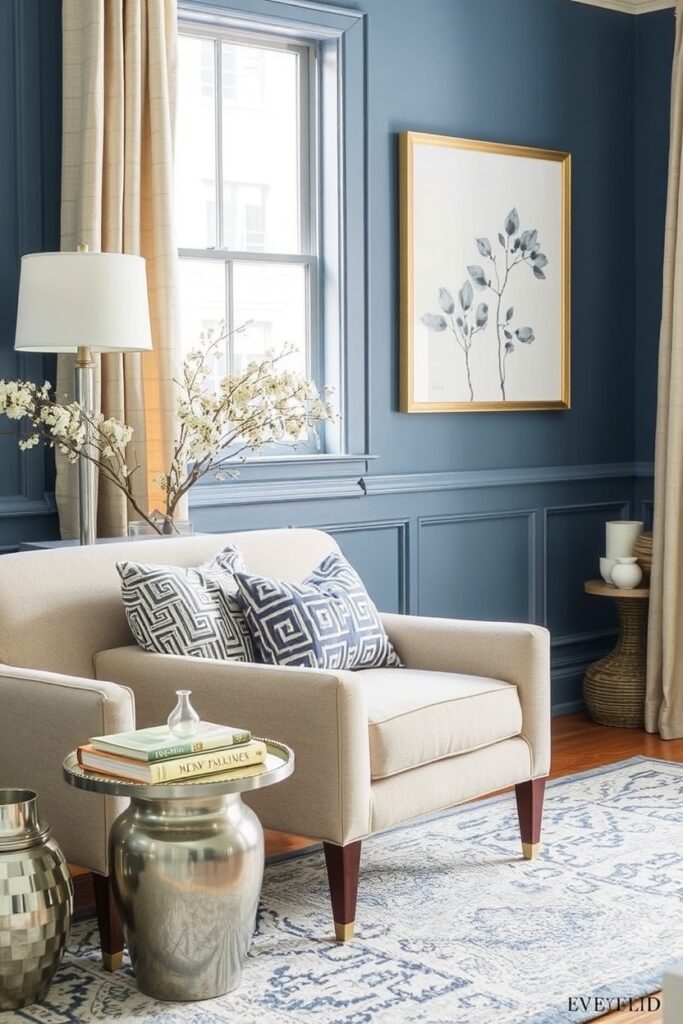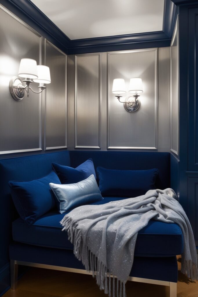 Create a reading nook in navy and nickel. Deep blue cushions, silver sconce lighting, maybe a soft gray throw that catches light like frost.