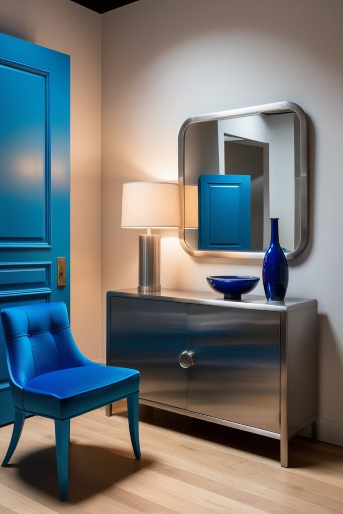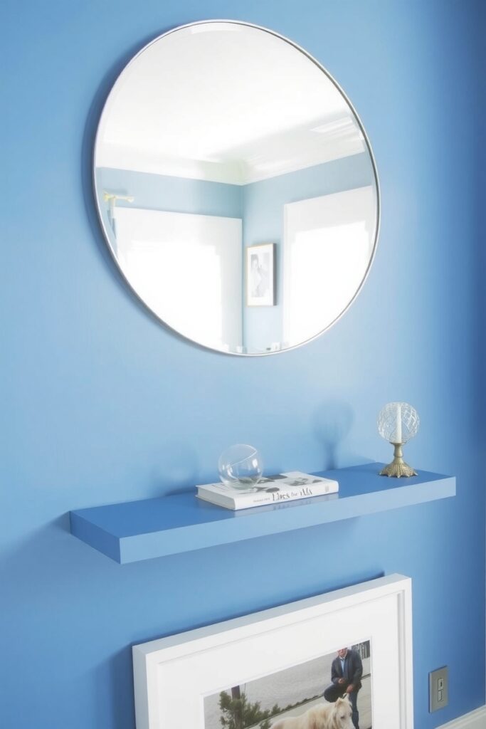 Install a narrow floating shelf painted soft cobalt. Above it, hang a frameless silver mirror. Keep objects minimal maybe a single glass orb, a book, a photo.