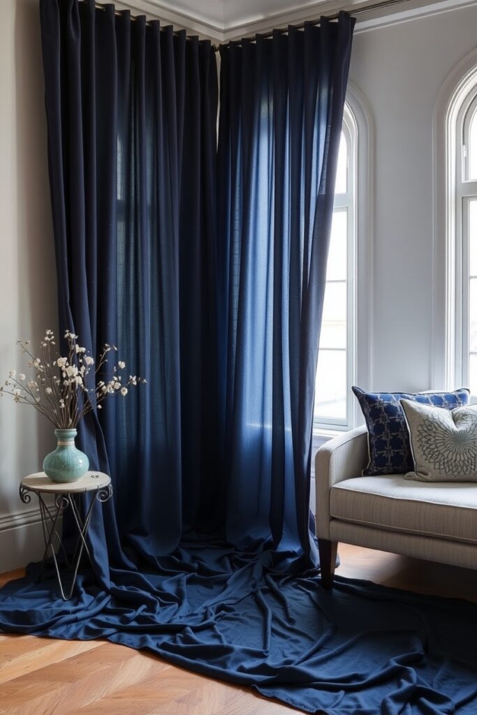 Go for deep indigo-blue drapes that pool onto the floor, almost like liquid. But here’s the magic have the fabric woven with faint silver specks, just enough to shimmer faintly when the wind moves.