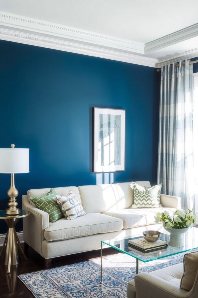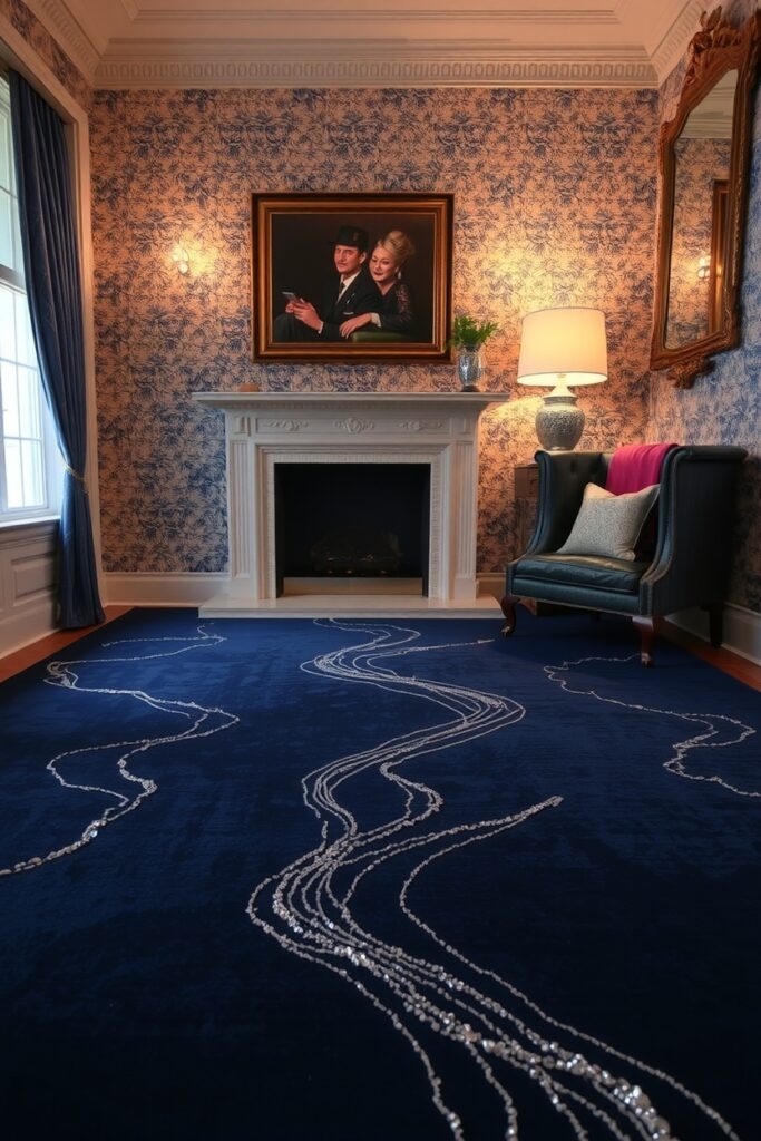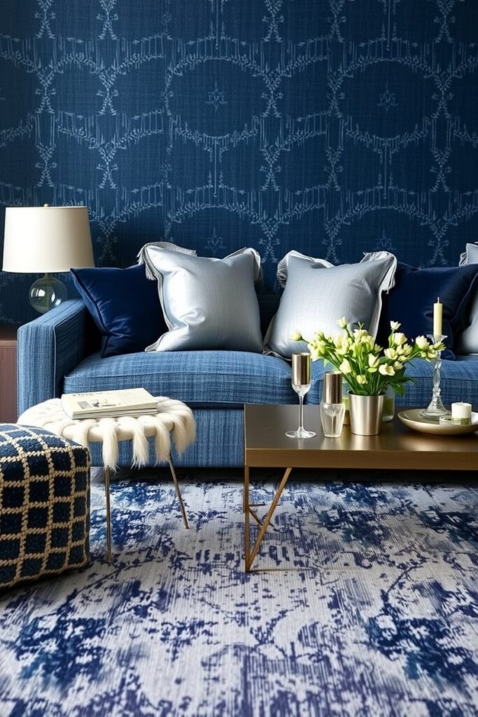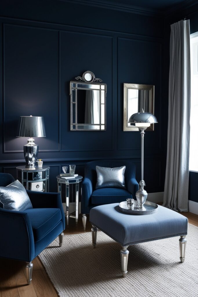 Here’s where blue and silver get their most cinematic. Think dark blue walls, almost black in low light. Add mirrored side tables, a silver art deco floor lamp, maybe a metallic tray on the ottoman.