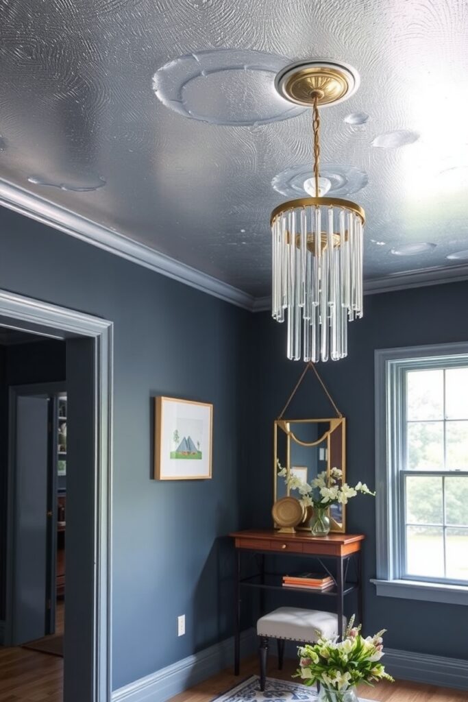 Paint your ceiling in a soft silver metallic wash not bright, not flashy, just enough for reflection. Keep your walls a slate blue, deep and grounding. When light hits from the windows, it’ll bounce softly, illuminating faces like candlelight.