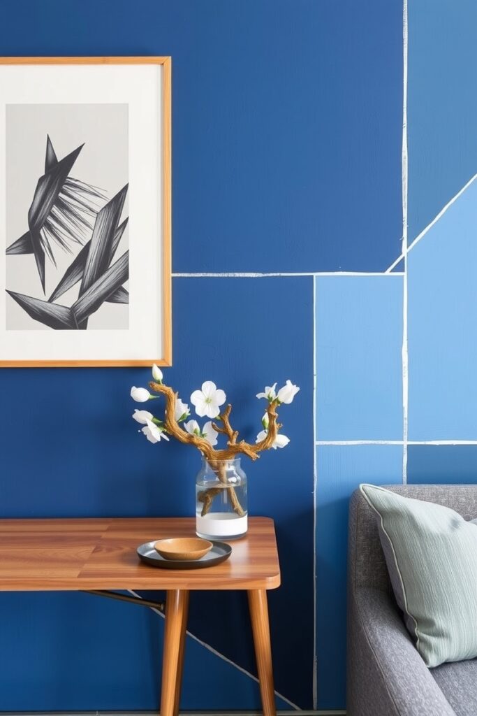 Modern art meets architecture. Create an accent wall where geometric shapes are painted in various blue tones from baby sky to moody midnight. Then outline a few with thin metallic silver paint.