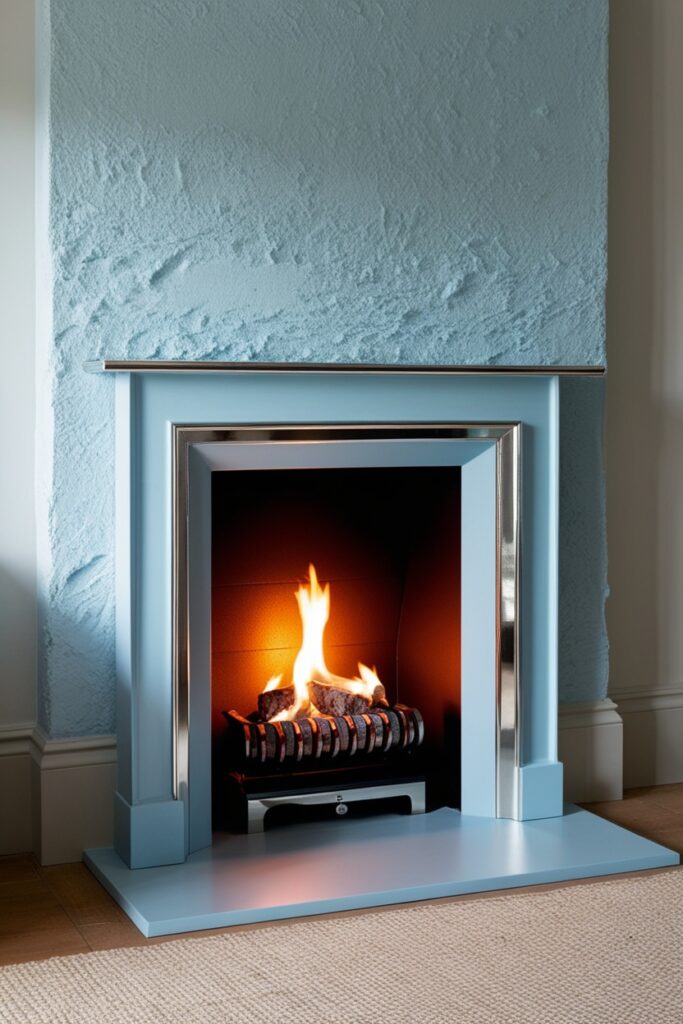 Paint your fireplace in pale ice-blue limewash uneven, textured, full of depth. Then add a simple silver mantel edge. Just a thin line of reflection.