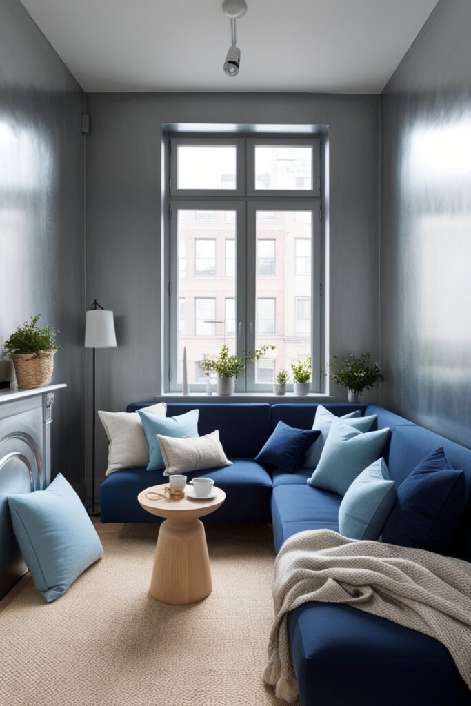 For modern lofts and city apartments go full cool tone but keep it warm in spirit. Paint the walls silver-gray, add navy upholstery, and sprinkle soft blue cushions.
