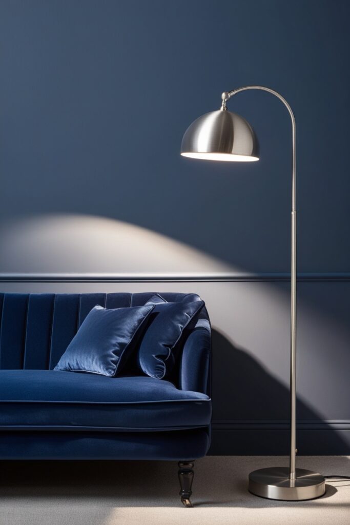 Get a navy velvet sofa. Then add a floor lamp with a brushed silver dome shade. When you turn it on, the velvet drinks the light. The shadows shimmer like liquid ink.