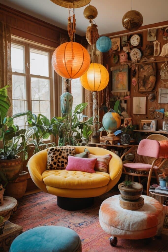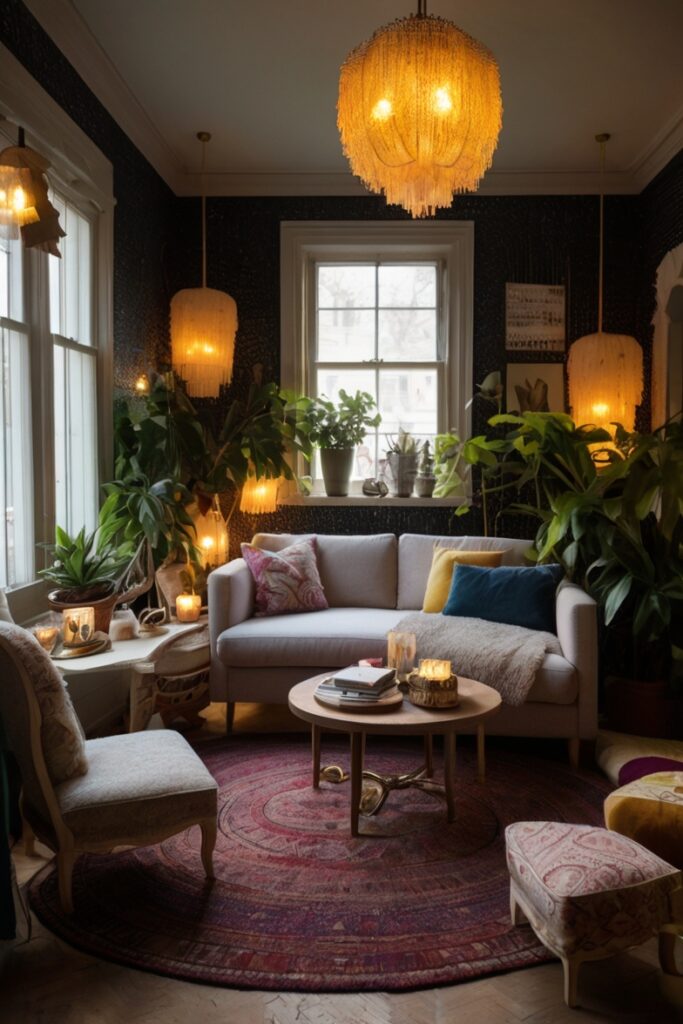 Lighting is everything, but in boho maximalist style, it’s not just function. It’s drama. Imagine a chandelier made of mismatched beads, a Moroccan lantern glowing in one corner, and a neon sign shouting from the other.