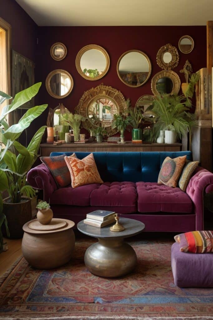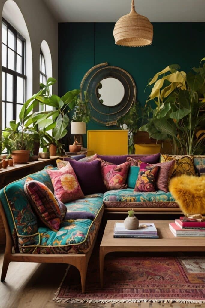 Every living room has a sofa, but a boho maximalist one? That sofa is loud. Maybe it’s crushed velvet in lime green. Maybe it’s a vintage floral piece with slightly frayed arms, but you keep it proudly.