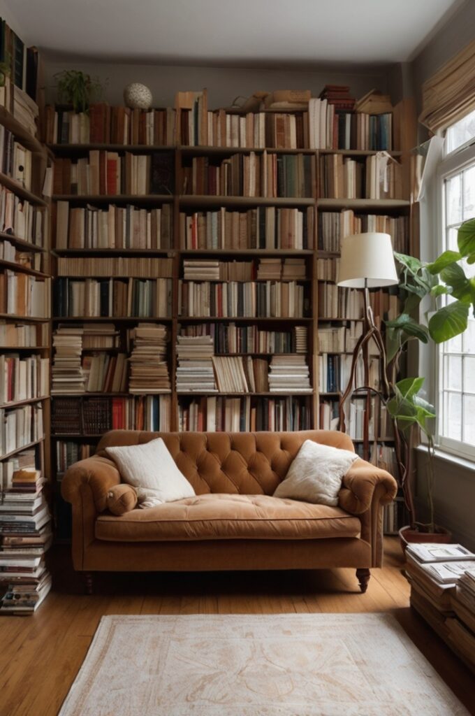 Forget neat libraries. Stack books on the floor, pile them under side tables, wedge them on window sills. Let them spill like they can’t be contained.