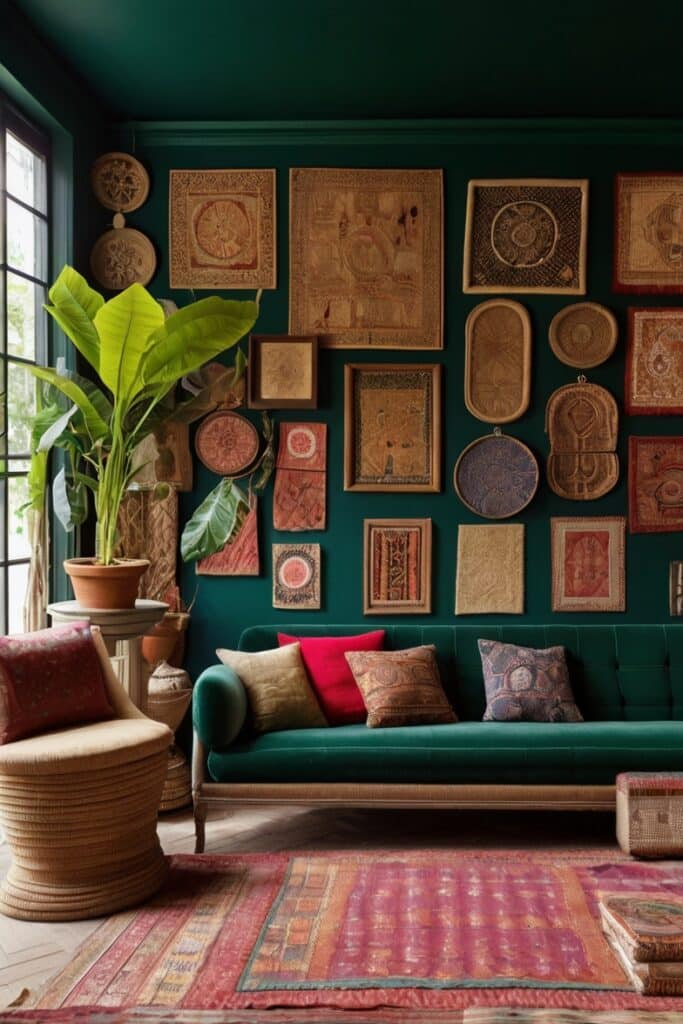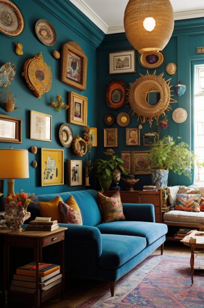 One big artwork? Too safe. A maximalist living room in 2025 is about gallery walls, but not neat gallery walls. Mix oil paintings with neon posters, framed embroidery with Polaroids taped with washi tape.