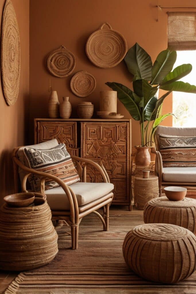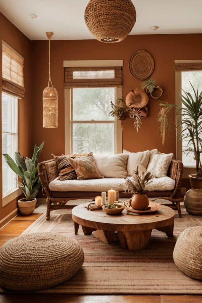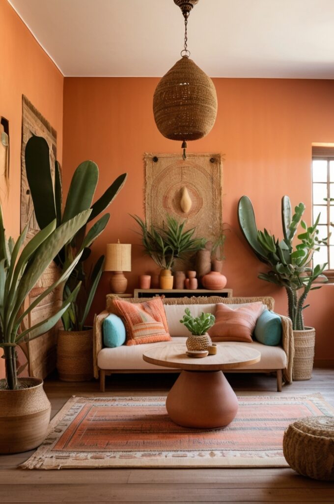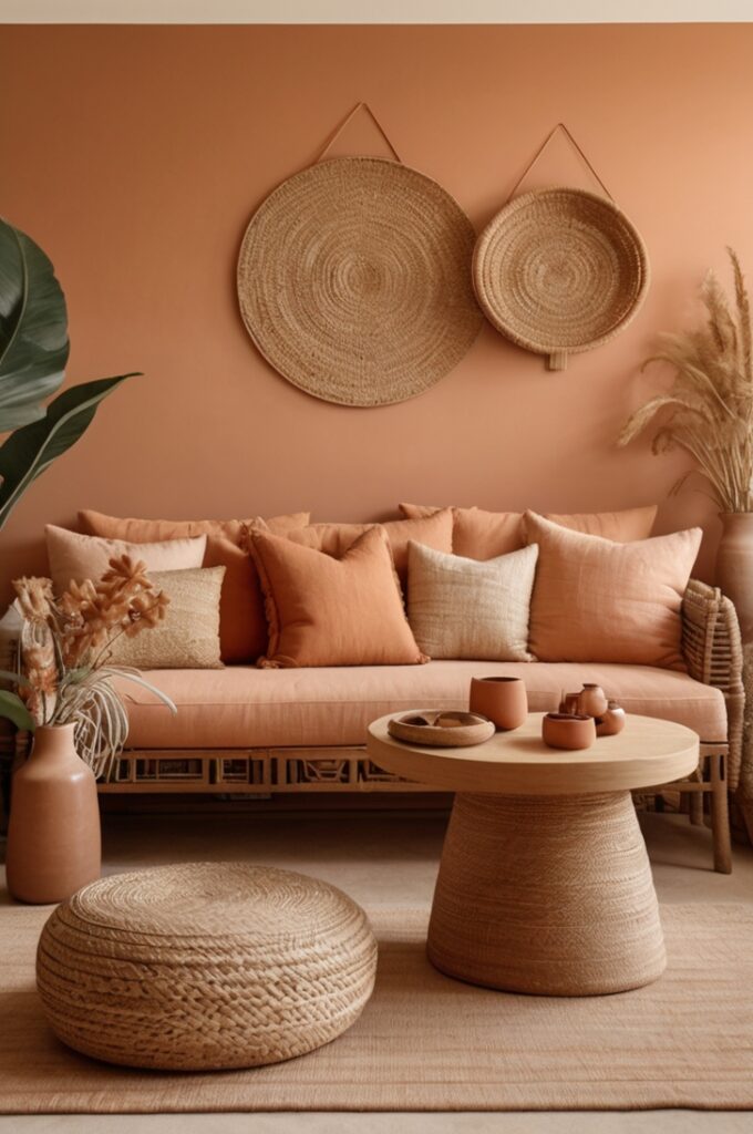 Paint a wall in warm coral clay and watch how woven rattan chairs glow. Add earthy rugs and sun-faded tapestries, and suddenly the space feels lived-in but alive. It brings energy without stealing the whole show.