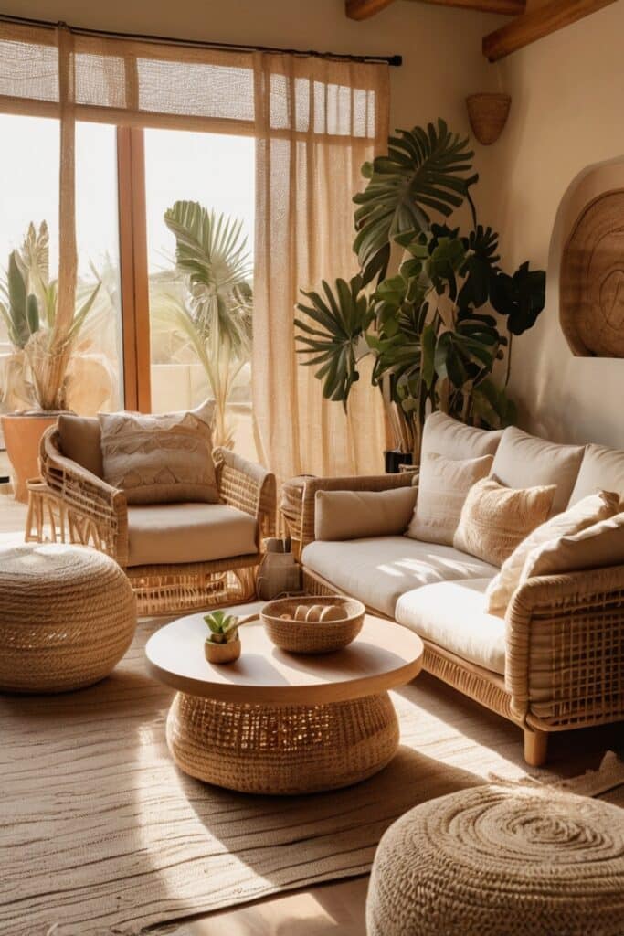 Against this backdrop, patterned cushions in mustard or olive look bolder. Rustic pottery feels more delicate. The whole vibe becomes airy, slightly whimsical, but still earthy.