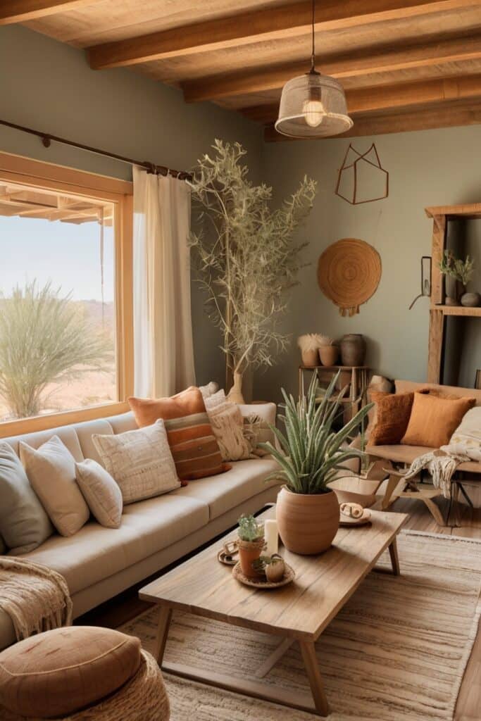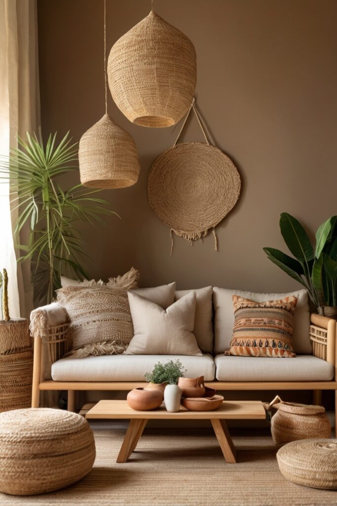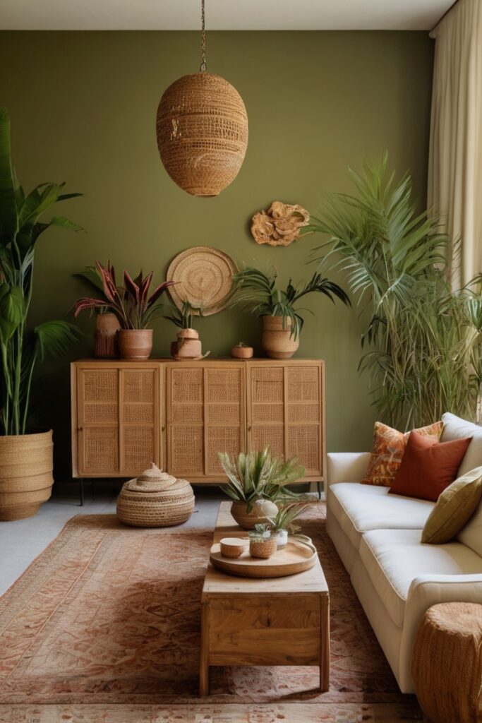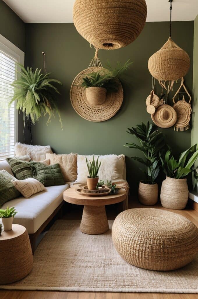 Walls in this shade make everything look handmade, even if it’s not. A plain linen sofa suddenly feels artisanal. Add macramé hangings, wood carvings, and bright pottery, and you’ve got a boho feast for the eyes.