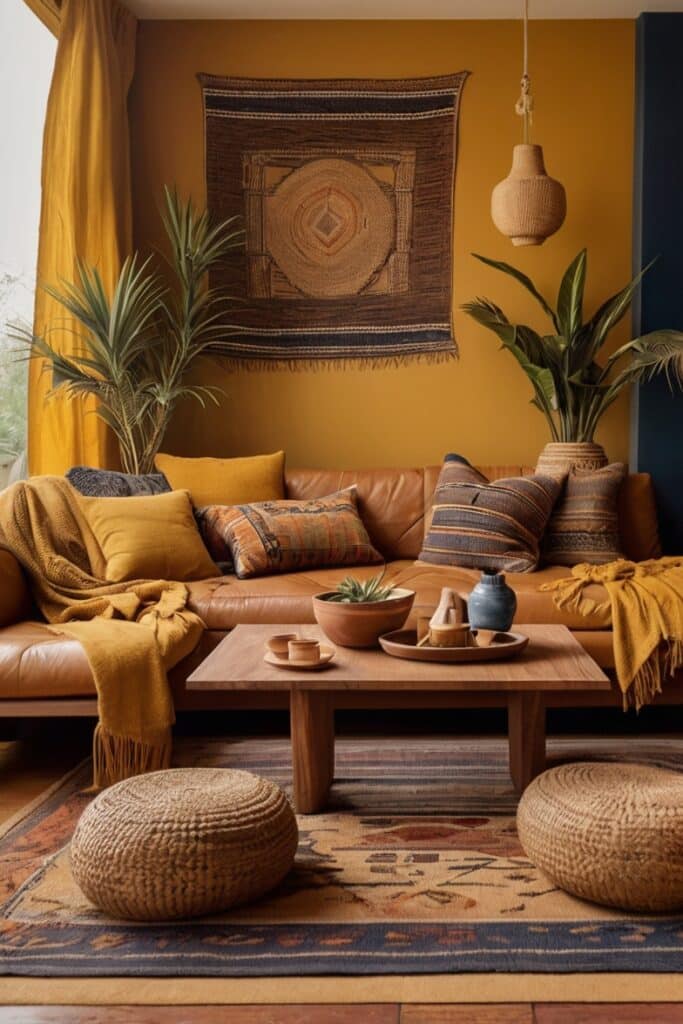 Mustard on walls has this weird ability to make wood grain look richer. Your old coffee table suddenly seems handpicked from a boutique. Add patterned boho rugs with crimson threads and it’s a mood, instantly.