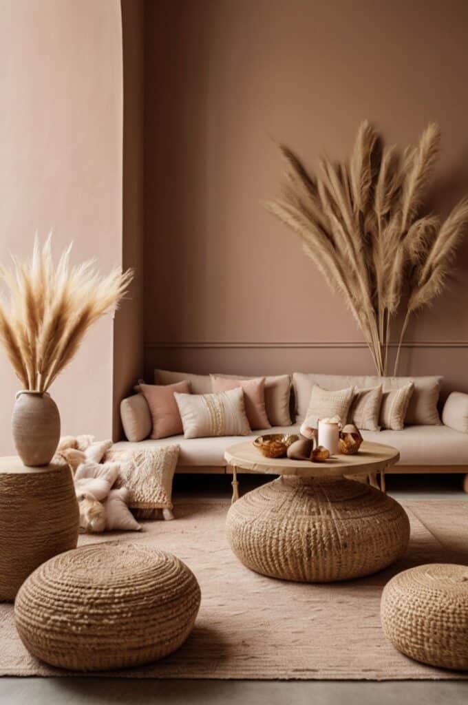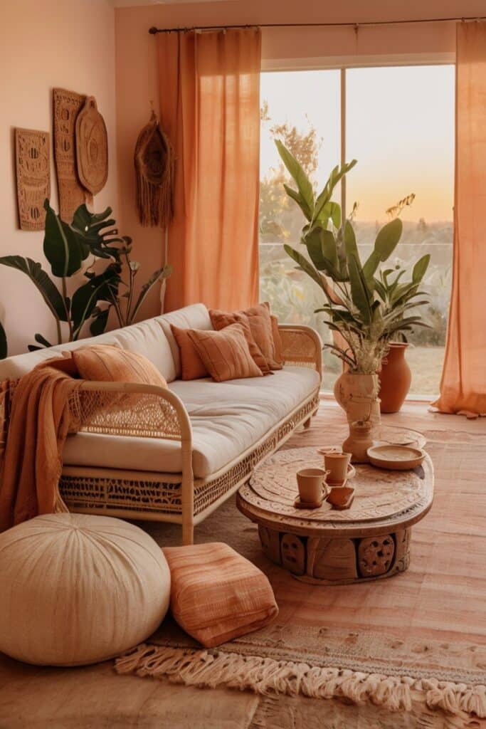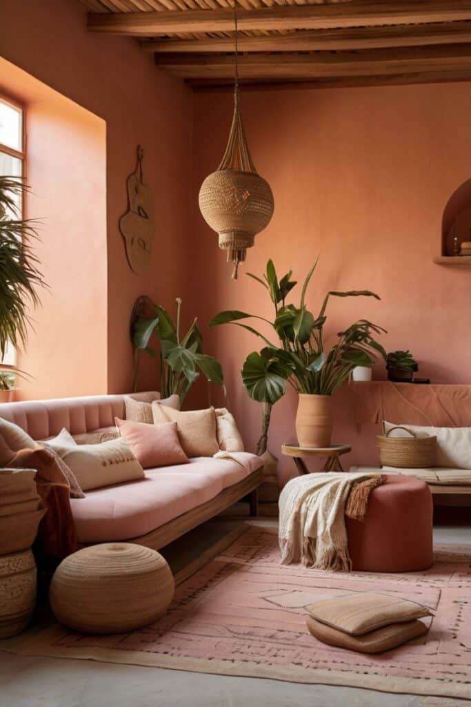 This shade softens everything around it. Even strong boho patterns become calmer when they sit next to clay-pink walls. It brings a little romance without losing the raw earthy edge.