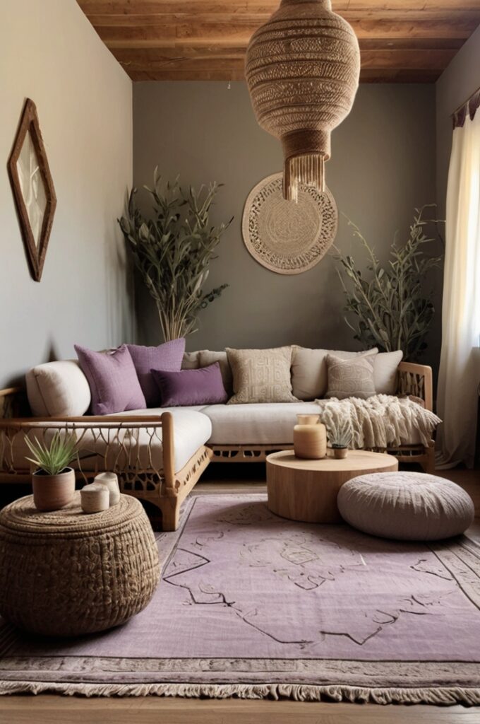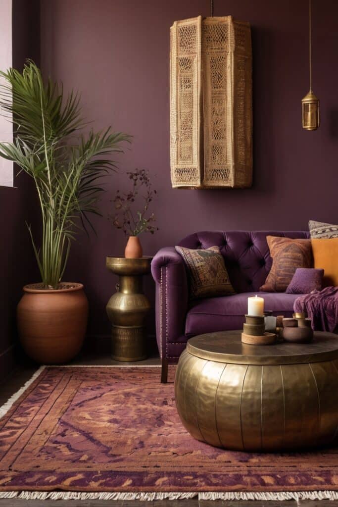 Boho rooms with smoky plum walls suddenly feel layered with history. Add Moroccan lanterns, dark wood tables, and thick wool throws, and the space hums with soul. It’s a color for storytellers, for corners that hold secrets.