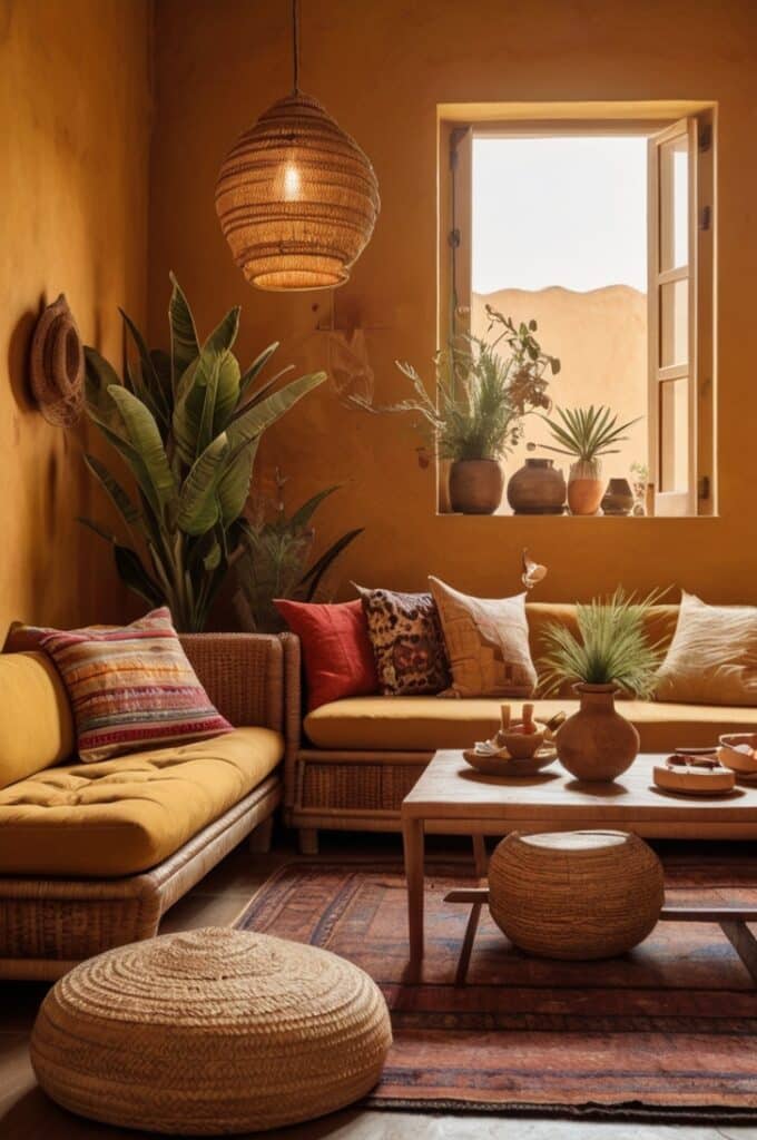 With ochre, you don’t need too much decor. A woven rug, some bamboo blinds, a stack of old books it’s enough. The walls themselves sing, pulling in boho warmth with little effort.