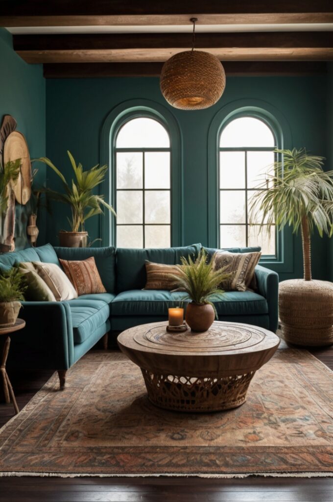 A living room in weathered teal feels adventurous. Add wicker lampshades, a low leather ottoman, and maybe a touch of copper decor. Suddenly the space feels collected from travels, not bought in one go.