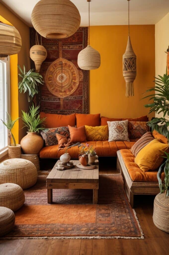 Paint a wall in this color, and it instantly becomes a focal point. Even plain beige furniture gets life against it. Add woven art, hanging macramé, or stacked floor pillows, and suddenly the whole place hums with energy.