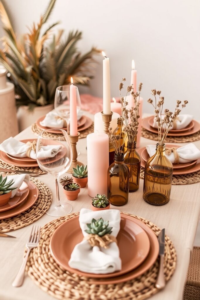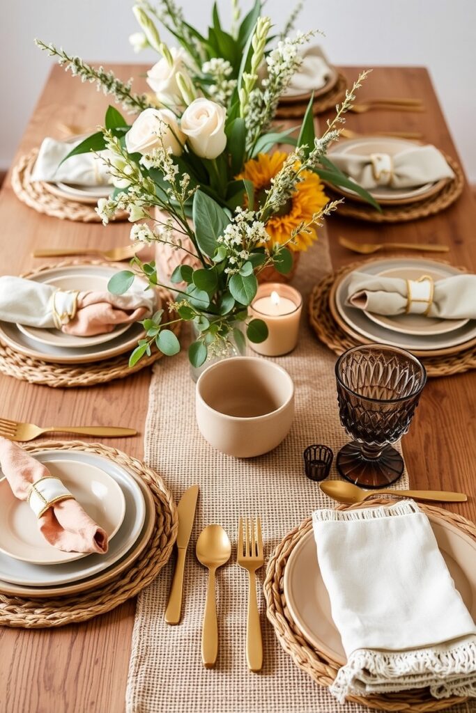 Add mason jars as glasses, and mismatched plates with tiny floral details. Throw in macramé coasters or knotted napkin rings for a modern Boho touch.