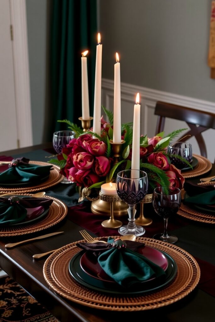 Use dark velvet napkins and brass candlesticks. Let colors melt into each other, like a painting come to life. Add glassware with colored tints plum, teal, maybe even smoky grey.