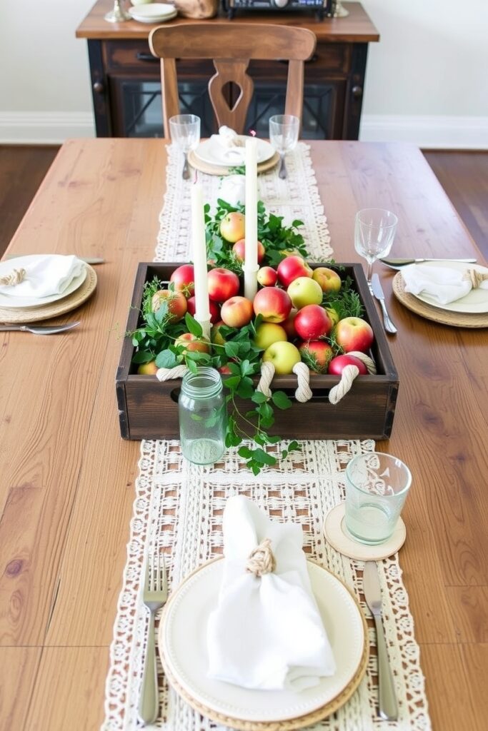 And for a centerpiece an old crate filled with apples, herbs, and a few candles tucked in between. It feels handmade, heartfelt, and impossibly inviting.