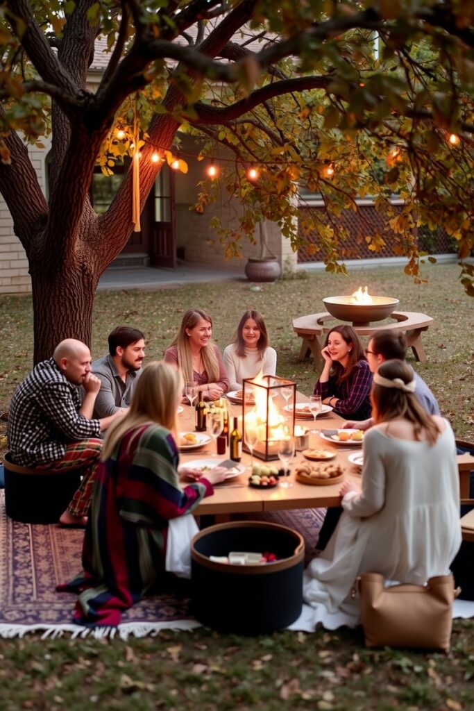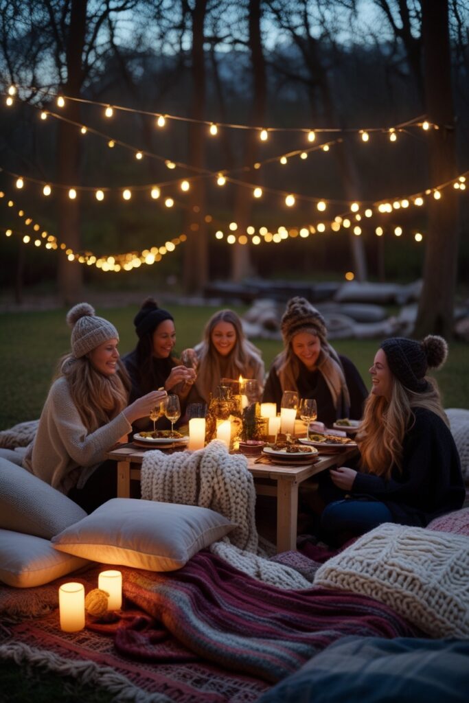 Use layers of blankets, chunky knit throws, and warm-toned lanterns all around. Keep the menu simple soups, pies, mulled wine food you can eat slowly while talking for hours.